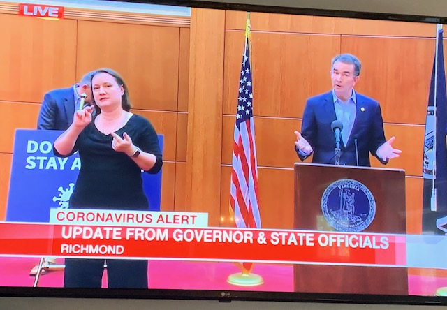 As part of the Commonwealth's COVID-19 Response, Reynolds ASL&IE Faculty and Program Head, Carrie Humphrey is one of two interpreters chosen to stand on the podium with Governor Ralph Northam as he delivers his video news briefings during the COVID-19 crisis.